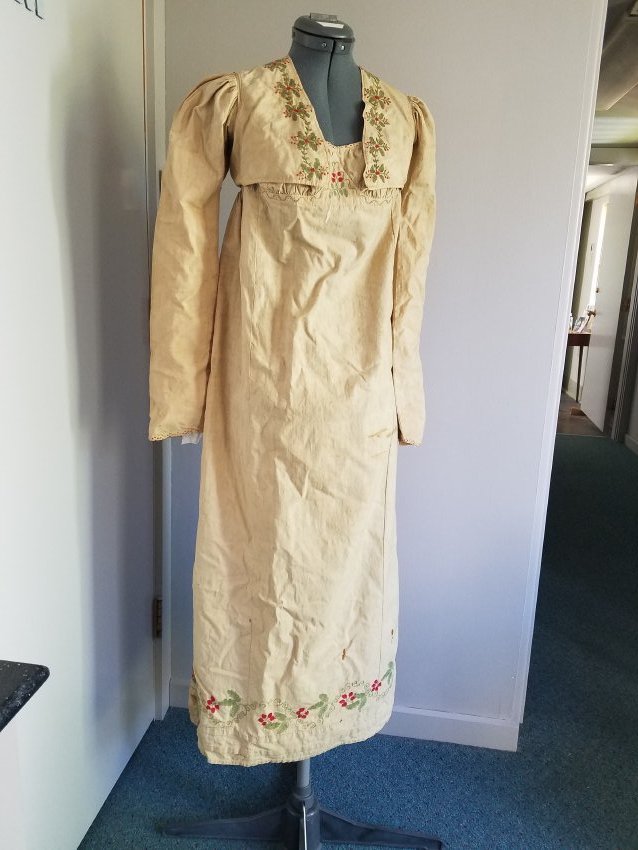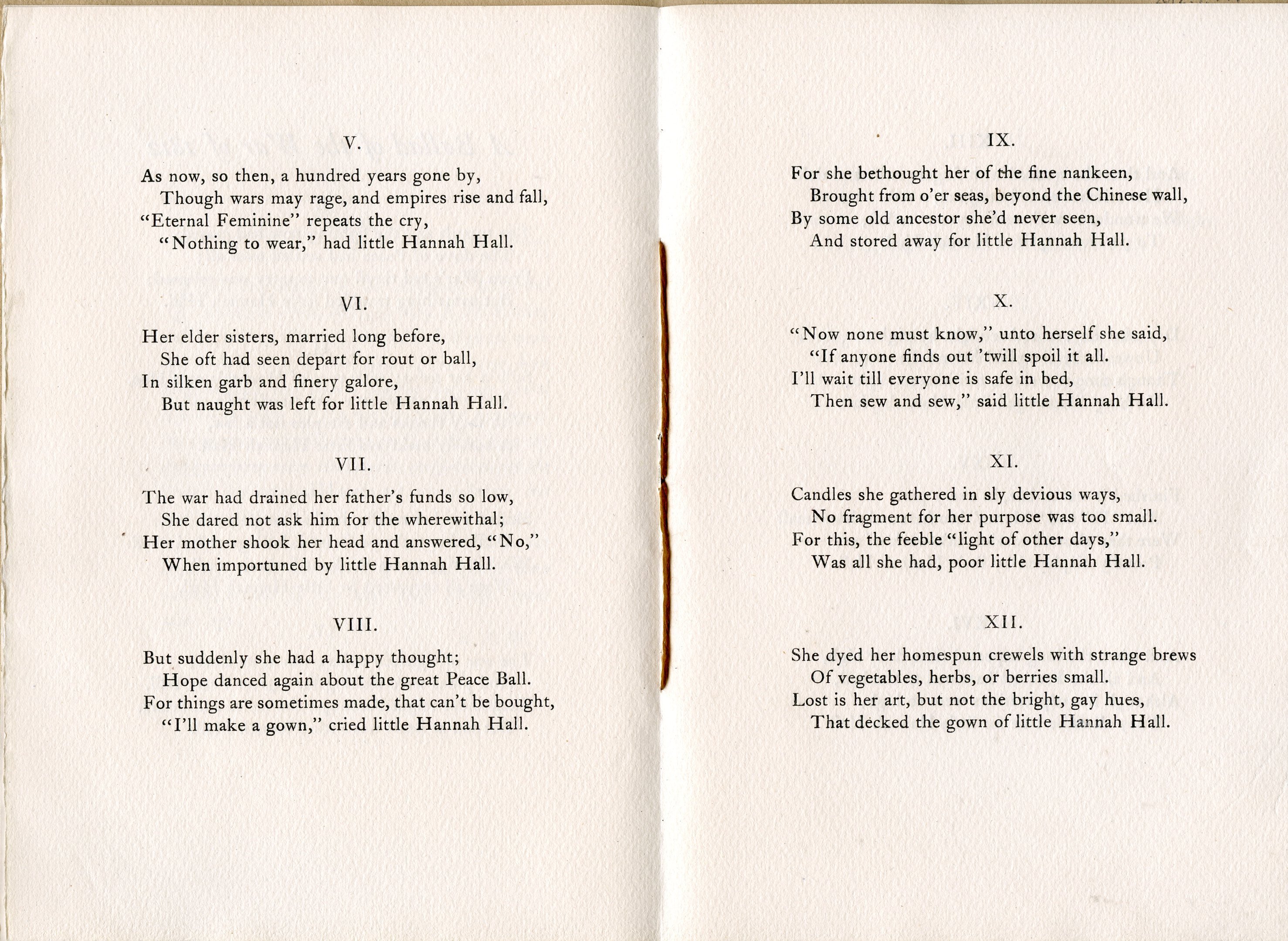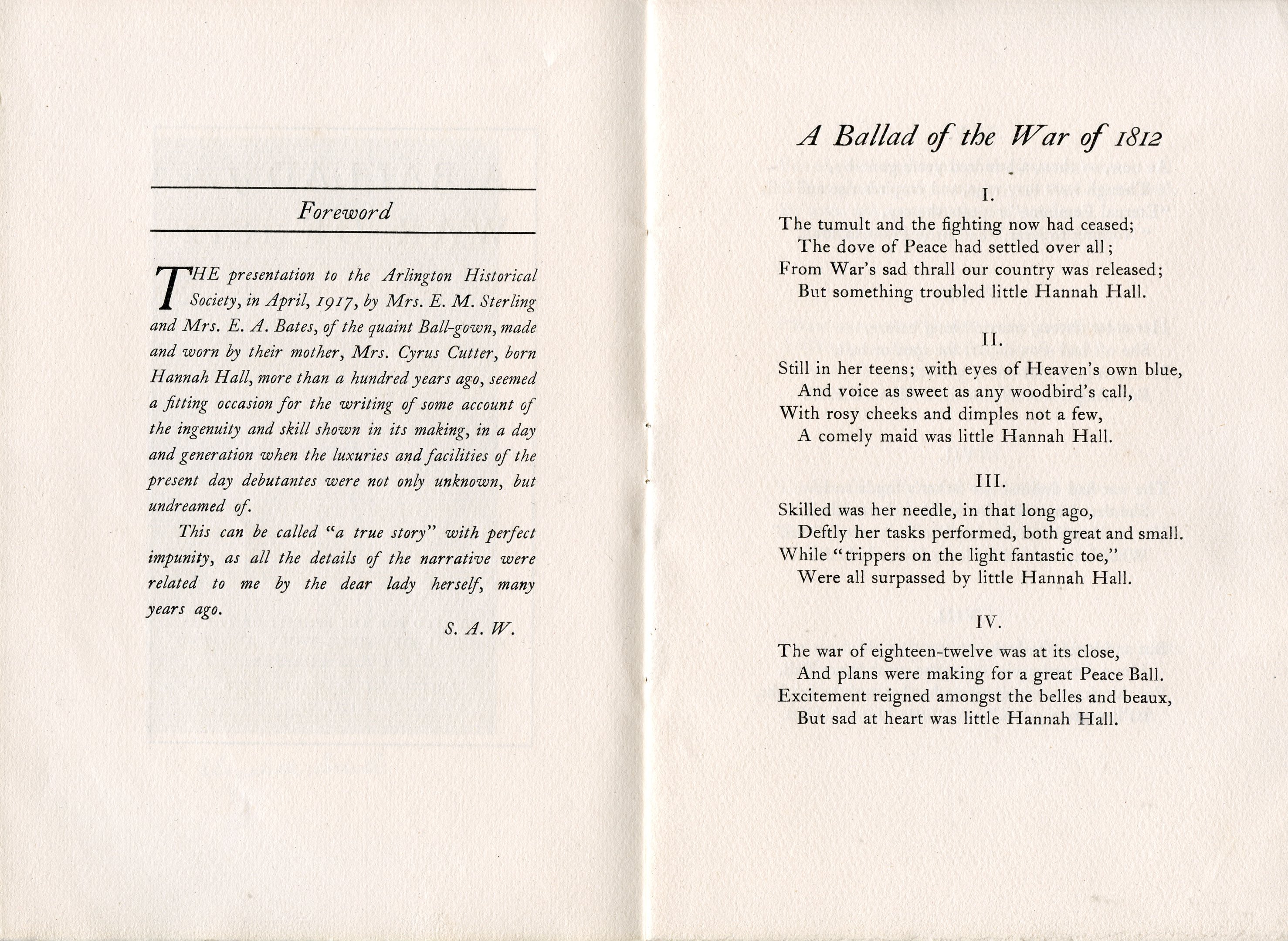 The presentation to the Arlington Historical Society in April 1917 by Mrs. E.M. Sterling and Mrs. E.A. Bates of the quaint Ball-gown made and worn by their mother, Mrs. Cyrus Cutter, born Hannah Hall, more than a hundred years ago, seemed a fitting occasion for the writing of some account of the ingenuity and skill shown in its making, in the day and generation when the luxuries and facilities of the present-day debutantes were not only unknown, but undreamed of.