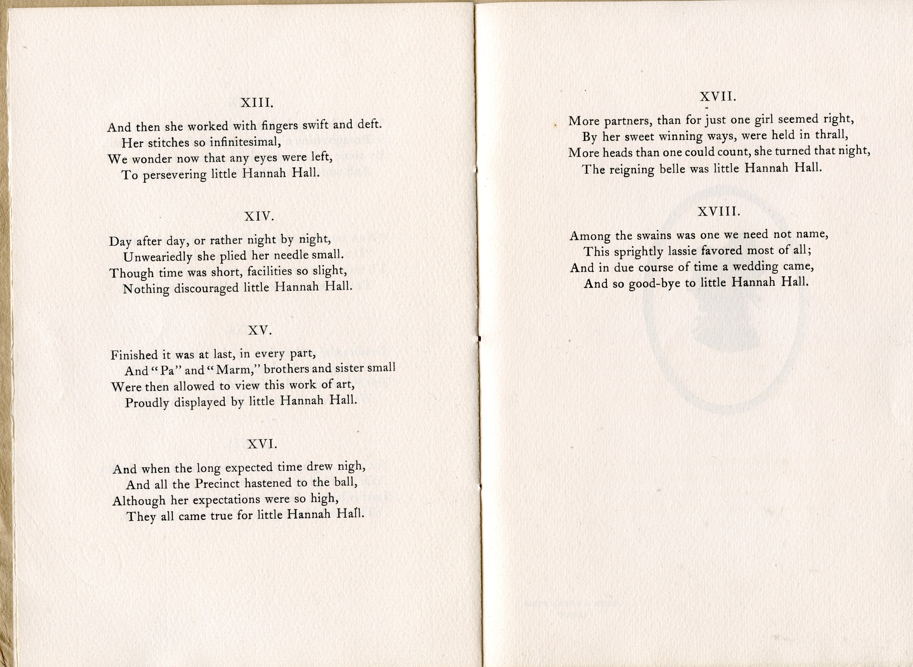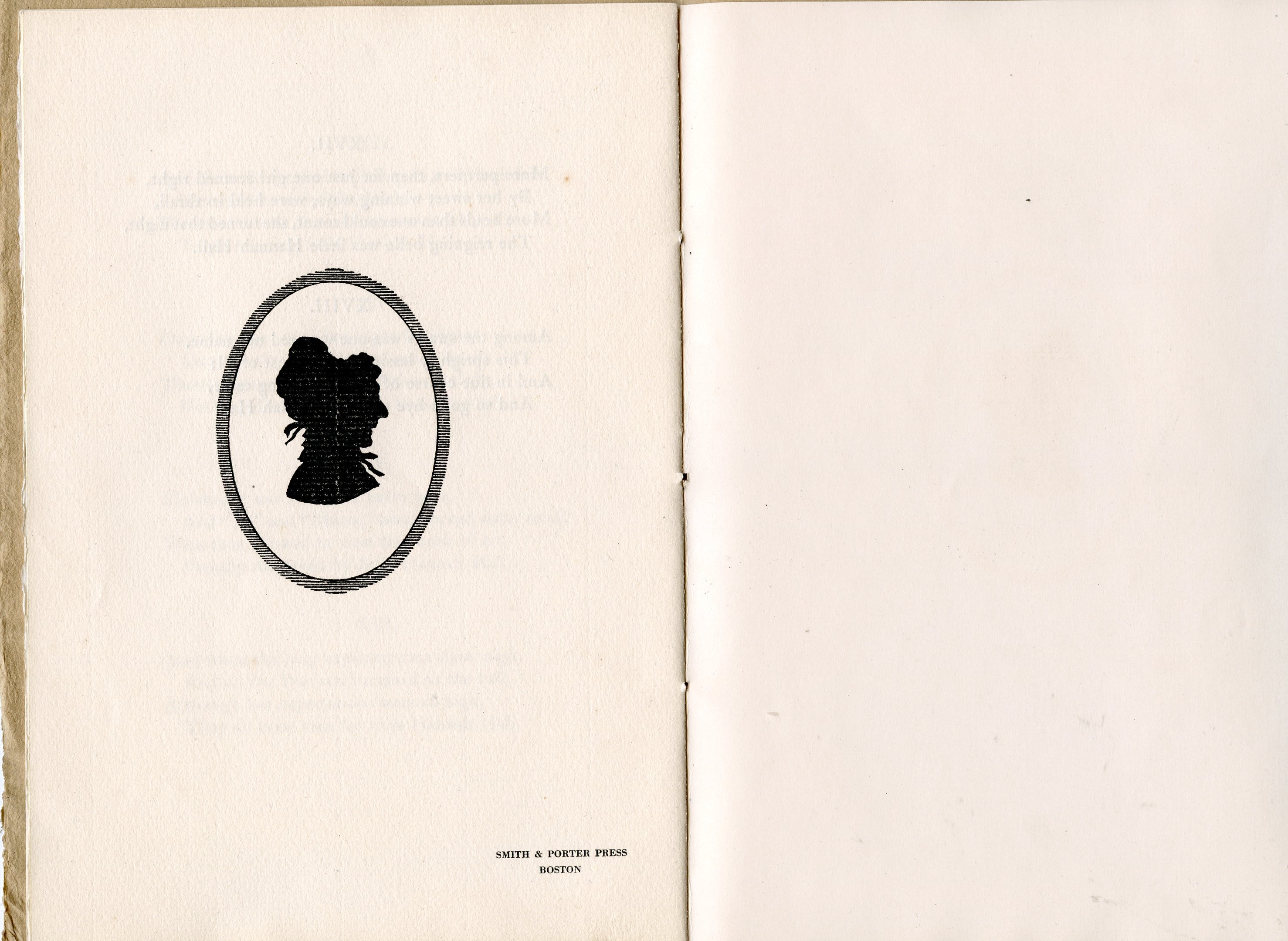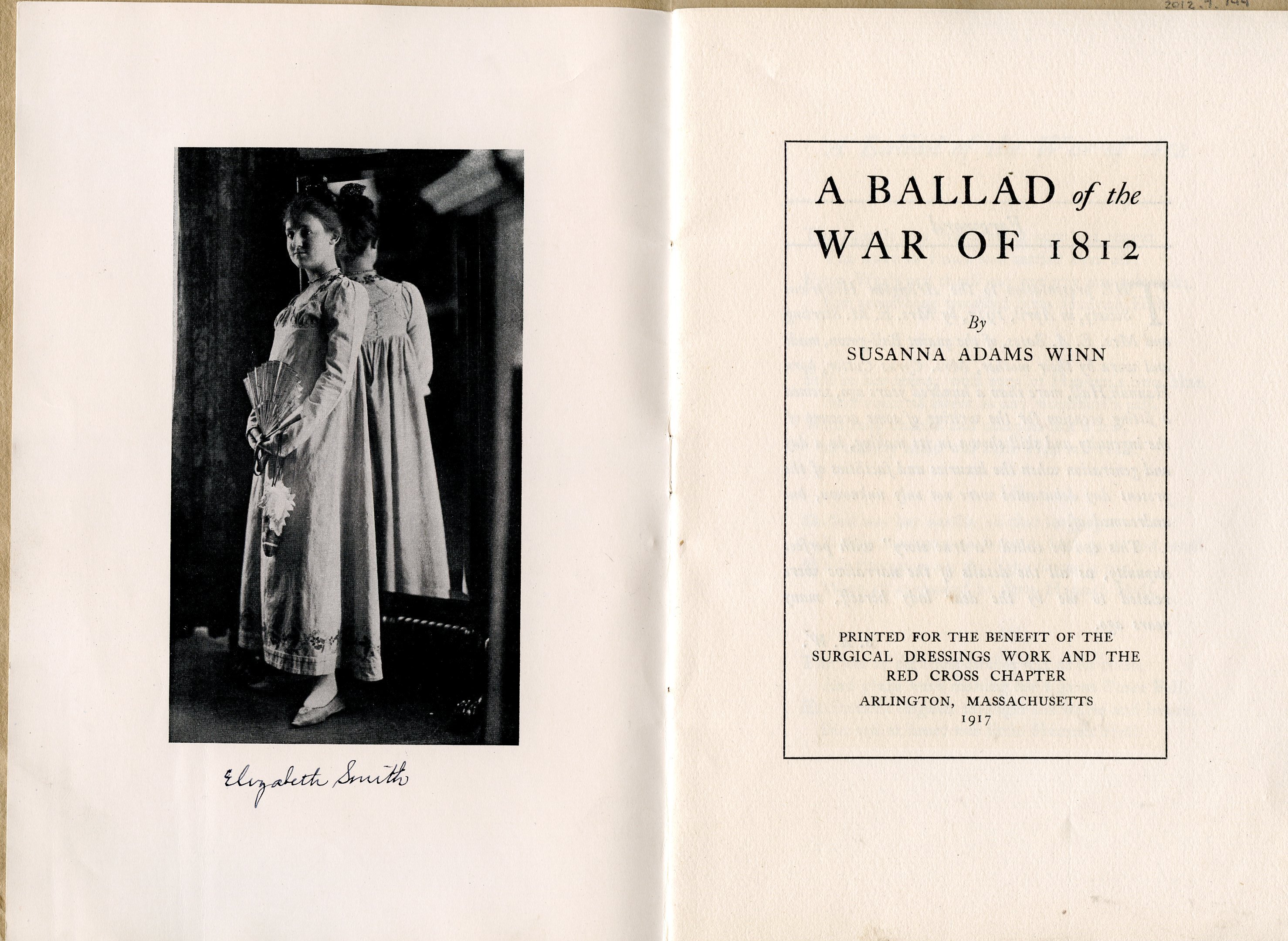 The collection of images below is a scanned copy of the poem read by “Aunt Sue” — Susanna Adams Winn — “The Ballad of the War of 1812.” The front cover includes an image of Elizabeth Abbot Smith in the dress worn by Hannah Hall Cutter and the back shows a silhouette of Hannah Hall Cutter. Both the dress and the silhouette are also in the Society collection. See further down on post for a full transcription of the text to facilitate reading the poem in its entirety without needing to open separate images from the scanned original booklet.
