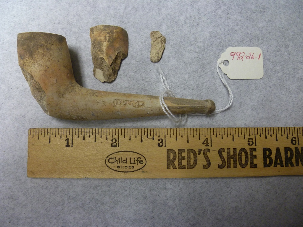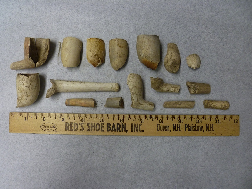 Pipe stems and bowls such as these are very common among finds at digs in the northeastern United States, given how common they were during the 17th, 18th, 19th, and early 20th centuries. They were made of kaolin, a type of clay that was pressed into a mold and sometimes stamped or decorated before being fired in a kiln. The smoker would periodically break off pieces of the pipe stem as they wore down and eventually discard the whole pipe, including the bowl. They were a disposable item.