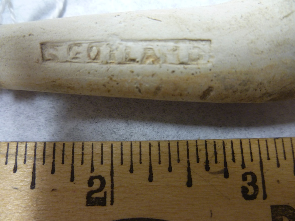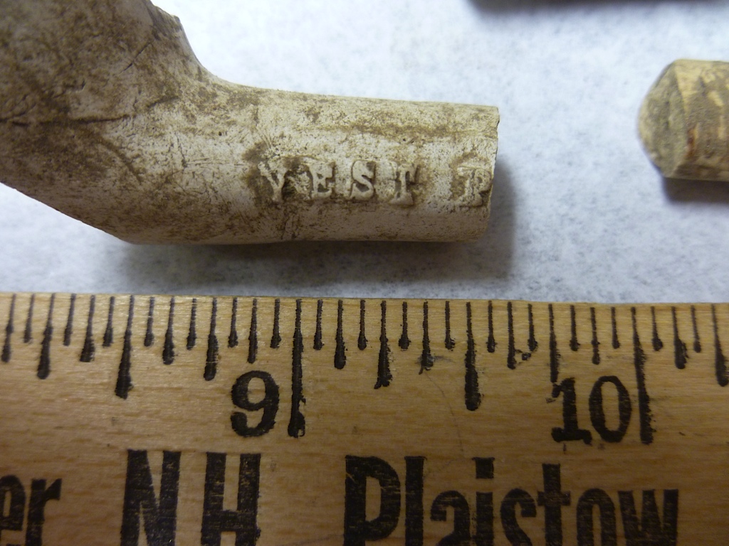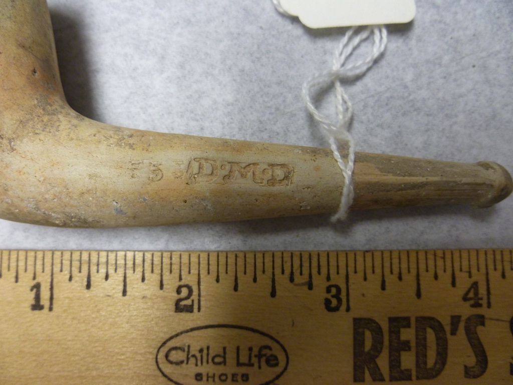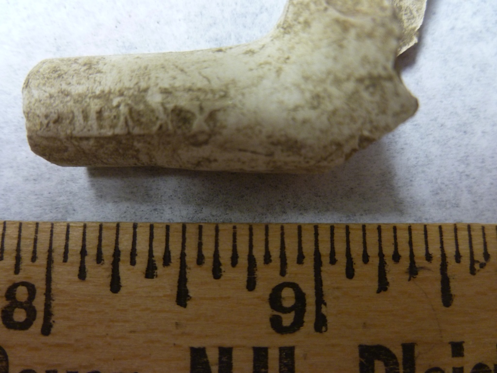 For archaeologists, clay pipe stems and bowls can help “date” a layer or a feature at a dig. Bowls and stems might be decorated with pictures or the maker’s or user’s initials, which could possibly be identified. The relative size and shape of a pipe bowl or stem is also often an indicator of its age; earlier pipe bowls are smaller, and newer ones are larger. The diameter of the hole in the pipe stem generally indicates the date the pipe was made. Archaeologists often use drill bits to measure the diameter of pipe stem holes. In general, the wider the stem hole, the older the pipe. My educated guess is that these pipes date to the late 19th century, but I’m hoping to have time in the future to do some more research into these pipe stems and bowls. Based on the diagnostic information they show, my goal is to figure out the meanings and contexts behind the words and symbols stamped into the pipes, and to measure the diameters of the stems for a more definitive date of manufacture.