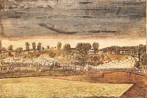 The engagement at the North Bridge in Concord, April 19, 1775. Engraved by Amos Doolittle, 1775.