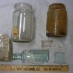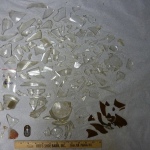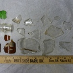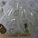 Many, many fragments of glass were found at the Jason Russell House dig, in all excavation locations. Glass doesn’t break down in soil easily, so it is among the most common kind of artifact found at archaeological digs in the northeast. The dig at the Jason Russell House yielded glass from window panes, beverage bottles, medicine bottles, and jars. The presence of different chemicals in glass determines its color. In this collection there is a variety of colors: clear, aqua, dark blue (cobalt), and dark green. The vast majority of glass fragments here are clear.