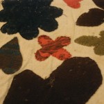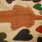 The quilt is beautiful, bright and lively, as well as very small. At just about two feet by four feet it may have been purely decorative. Small quilts were sometimes made to hang on a wall, drape over the sofa, or decorate another surface in the house. Since the quilt also shows very few signs of wear and tear, and the stitches on the quilt are not very tight, the quilt was very likely more for decoration than for warmth or sleeping.
