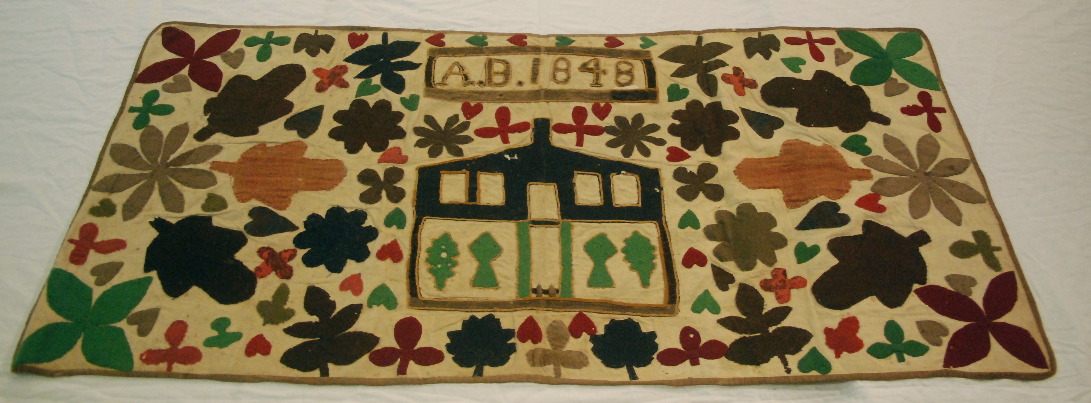 192526-6The Rourke quilt has a visual tie to the Jason Russell House, and Arlington History. Look closely at the central motif of the quilt. A small house with a central chimney and a central door are framed by windows on either side, with 5 windows above. It is the same exact architecture of the Jason Russell House! This style of house can also be seen all across New England, built from the 17th through the 19th century. In fact, the Wales Public Library, built in 1865 is also the same style. Whoever AB was, it is likely that this house existed in her everyday life, or perhaps in paintings or drawings, and the flora and fauna included surrounded them for inspiration.