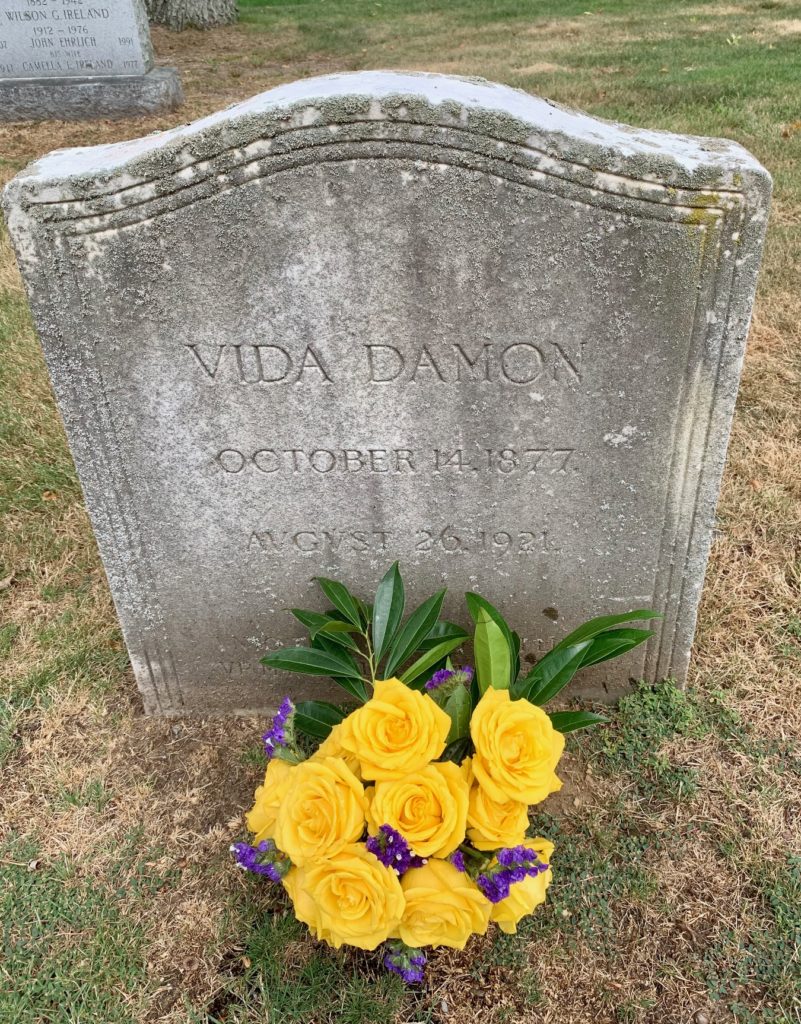 In Nina Winn’s diary entry for May 7, 1922, she wrote of visiting Mount Pleasant Cemetery and viewing the grave of her close friend since childhood, Vida Damon, where a marker had been installed recently. Nina wrote: “Saw Vida’s stone—very severe and simple & beautiful.”