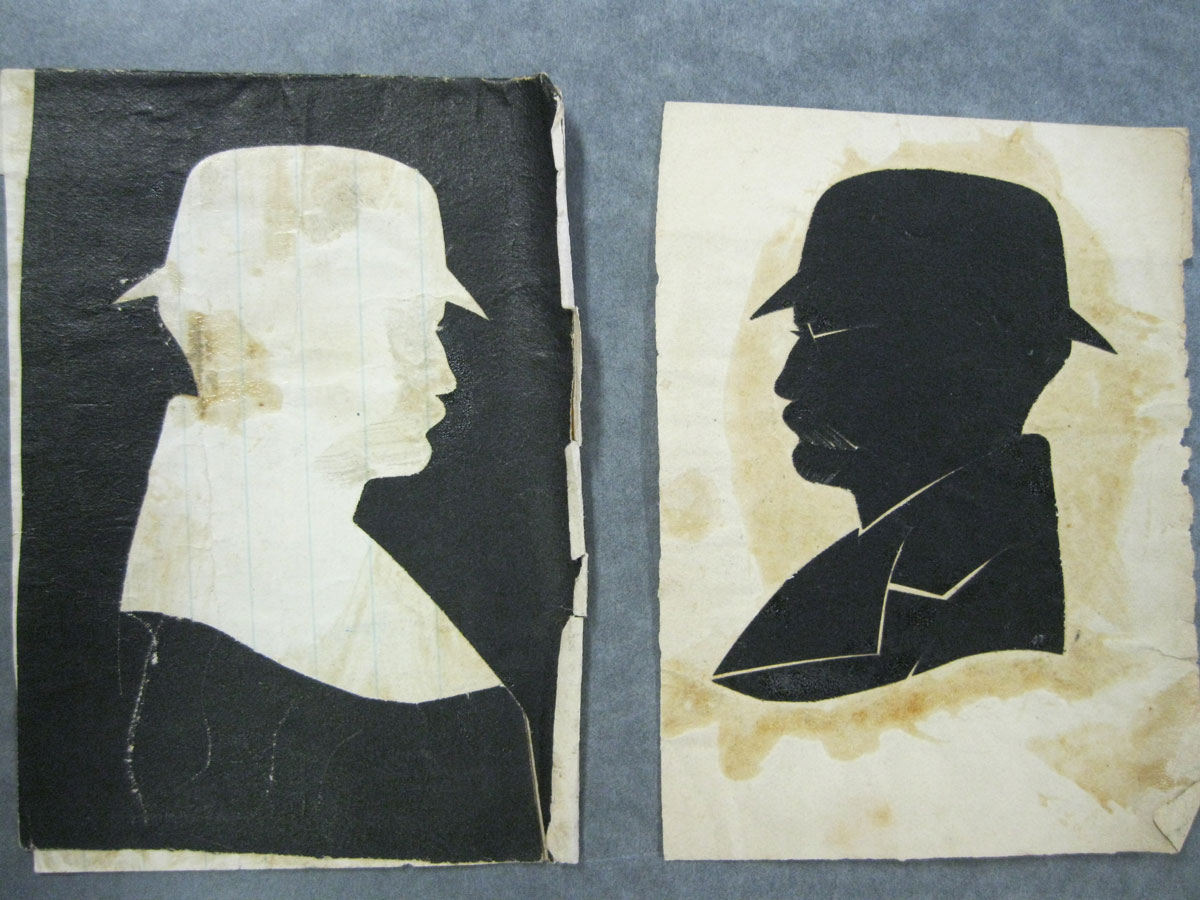 Knowing that Susanna Adams Winn was indeed the artist responsible for the creation of the silhouettes helps to put the album into context. As mentioned previously, Susanna was an artist and her art was often featured in her social activities. On February 25, 1876, Susanna “went over to [visit] Mrs. Whittemore and took some of my pictures for all to see.” As evidenced by her May 25th entry, she made silhouettes when visiting friends and families so that the making of the portraits acted as an activity and the album itself was an object to be shared and admired in her parlor at home. The method of making her silhouettes is also suggested by understanding that she was taking her craft on the road making it more likely that she was hand-cutting the images. A discovery of some partially completed silhouettes in a box of new donations to the Society in February of 2012 helps confirm her process. Included are mirror images of the same individual taken at the same time suggesting that she folded the paper in order to both supply stability when cutting (the same process used by Eduoart) and to produce multiple images at the same time. Also in the collection are several slightly different images of the same individual (in this case, her brother George Prentiss Winn wearing the same glasses and hat), that show repetitive attempts at cutting the likeness. ((These particular silhouettes were not included in the album but were tucked away in the back of George Winn’s 1872 diary. Curiously, silhouettes for George P. Winn and his wife Melissa (Bacon) Winn are not included in the album. There are two empty slots in the album near the front where the rest of Susanna’s family images are placed, including those of her other two brothers and their wives.))