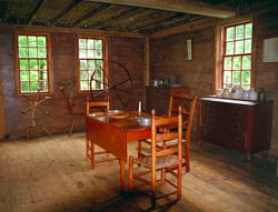 Jason Russell House KitchenThe kitchen is one of the first two southern rooms built by Jason Russell. It has a large fireplace on the north wall with two baking chambers to the left. A window on the south wall looks out over the herb garden. There was a door to the farmyard on the south wall, but this was sealed-up in the 1800’s. Two windows on the front of the house over look the farm’s gateyard, the stone wall enclosed area used as an outdoor work space by the family.