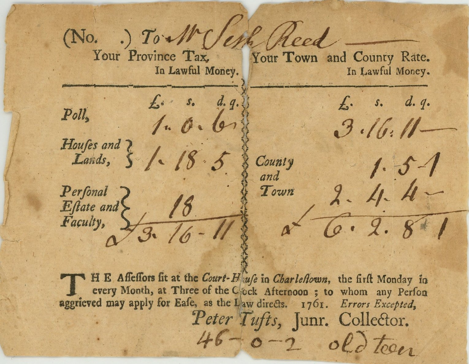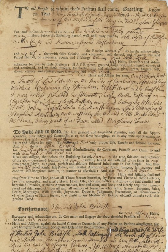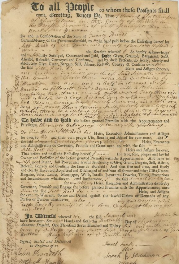 Seth Reed was an active member of society in Arlington and served in public office for several years. He served as a prudential committee man on and off between 1740 and 1767. As a prudential committee man, the town required Seth to manage the school system. Since the 17th century, most communities in New England provided tax-supported public education. In 1642, Massachusetts law stated that parents were to teach their children to “read & understand the principles of religion & capitall lawes of this country,” and to write and learn a trade. In 1647, Massachusetts established a free school system. Each district in Massachusetts hired a prudential committee man who hired teachers, repaired the schoolhouse and managed the school district.