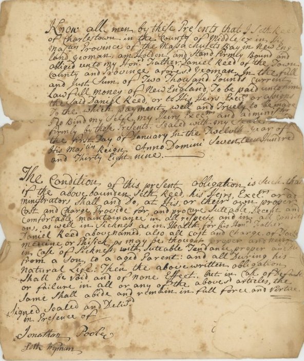 Seth Reed wrote his will on March 6, 1783. It included an inventory of his estate as well as a list of expenses to be paid after his death. In his will, Seth appointed his son Daniel as his executor. He left a silver tankard for Daniel, and a silver porringer each to his daughter Lydia Smith and his granddaughter Rhoda Reed. To his granddaughter Hannah Reed he left “four large silver spoones and six silver tea spoones and one pair of gold sleeve buttons.” Vital records of Arlington, MA reveal that Seth Reed died of age and dropsy on March 18, 1783 at age 80. Dropsy, now known as edema, is an abnormal accumulation of excess water, causing the swelling of soft tissues.