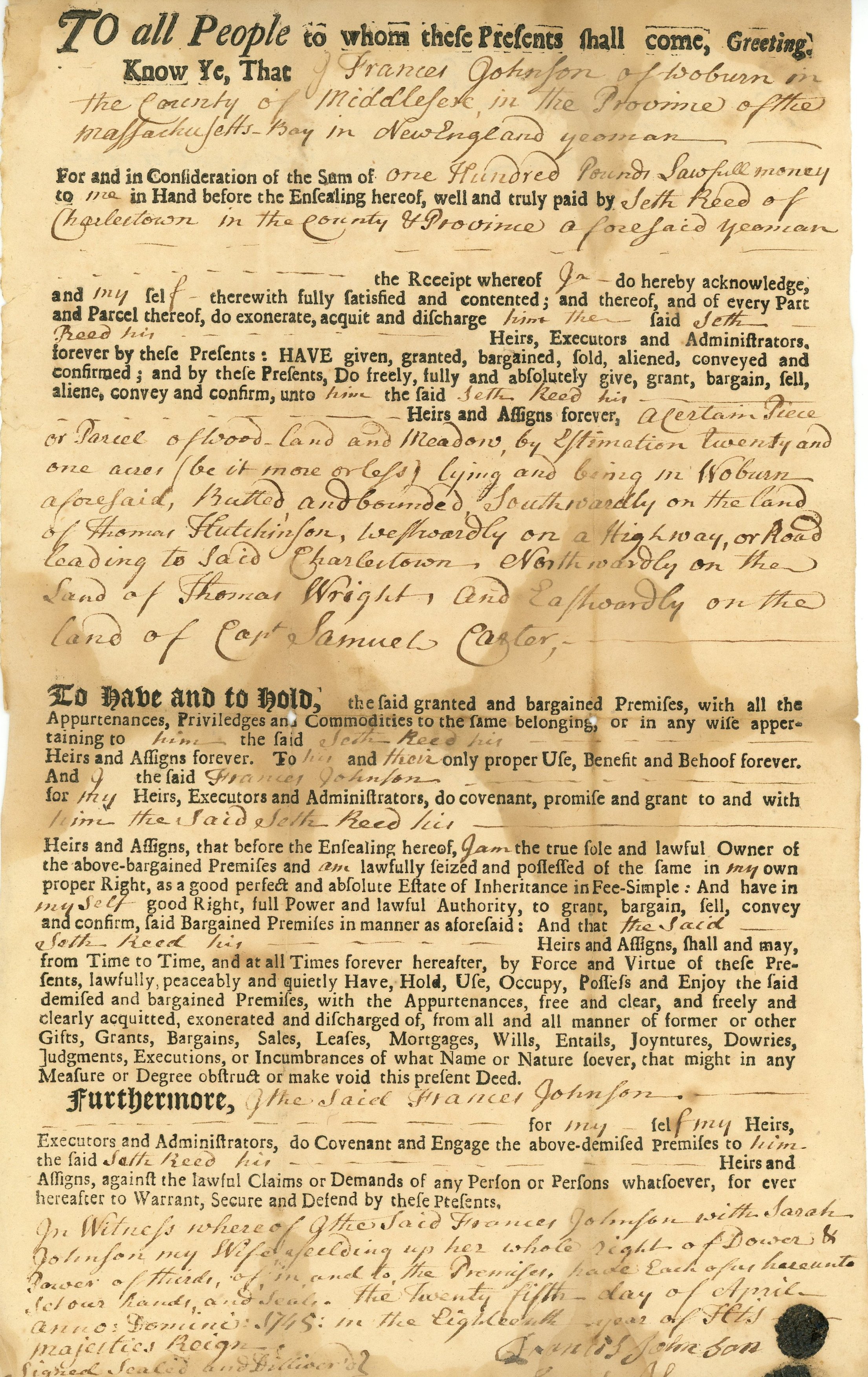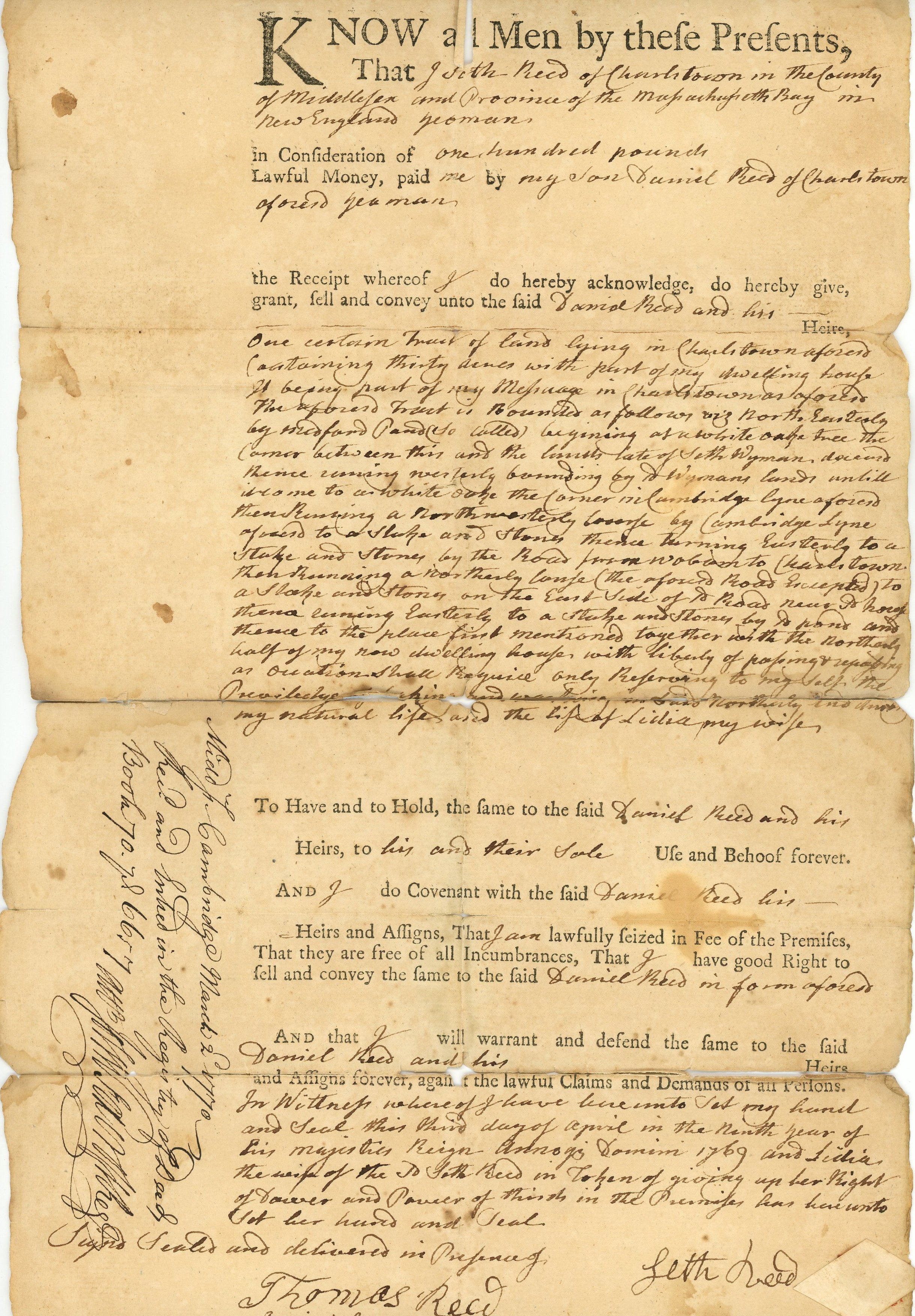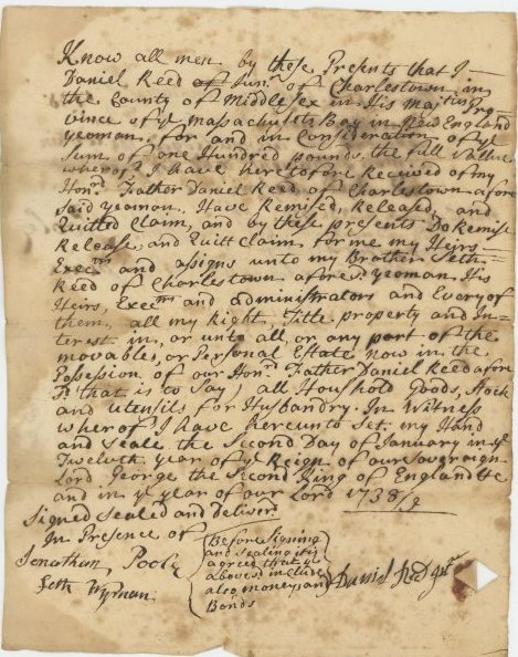 Seth Reed, like his family before him, was a farmer. However, he accumulated more wealth than his father Daniel, and built a newer home for his family in 1762. On April 3, he wrote up a contract between “Husbandmen” Seth and Thomas Reed and “Housewright” Enoch Hamond. A housewright was someone who built and repaired houses, especially wooden ones.