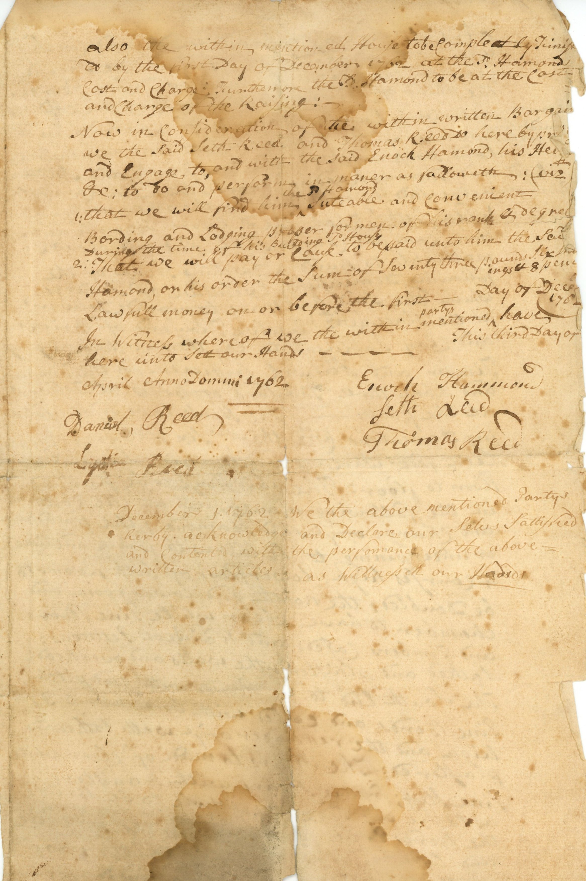 Page one of the contract between Enoch Hamond and the Reed family.