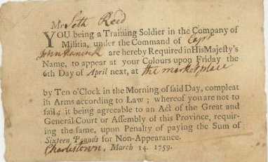 Like most men in the colonies, Seth Reed served in the local militia. In 1759, Seth trained as a soldier under the command of Captain John Hancock. He would have been in his mid-50s. Before the Revolutionary War, the militia drew its members from the local community, requiring all able-bodied men (sometimes including indentured servants and slaves) ages sixteen to sixty  to serve and equip themselves. The commander of these local troops would schedule an annual Muster Day to allow the militia to practice. However, disciplined practice occupied only a small portion of the day. Muster days usually involved celebration and ministers even complained that they resembled a carnival.