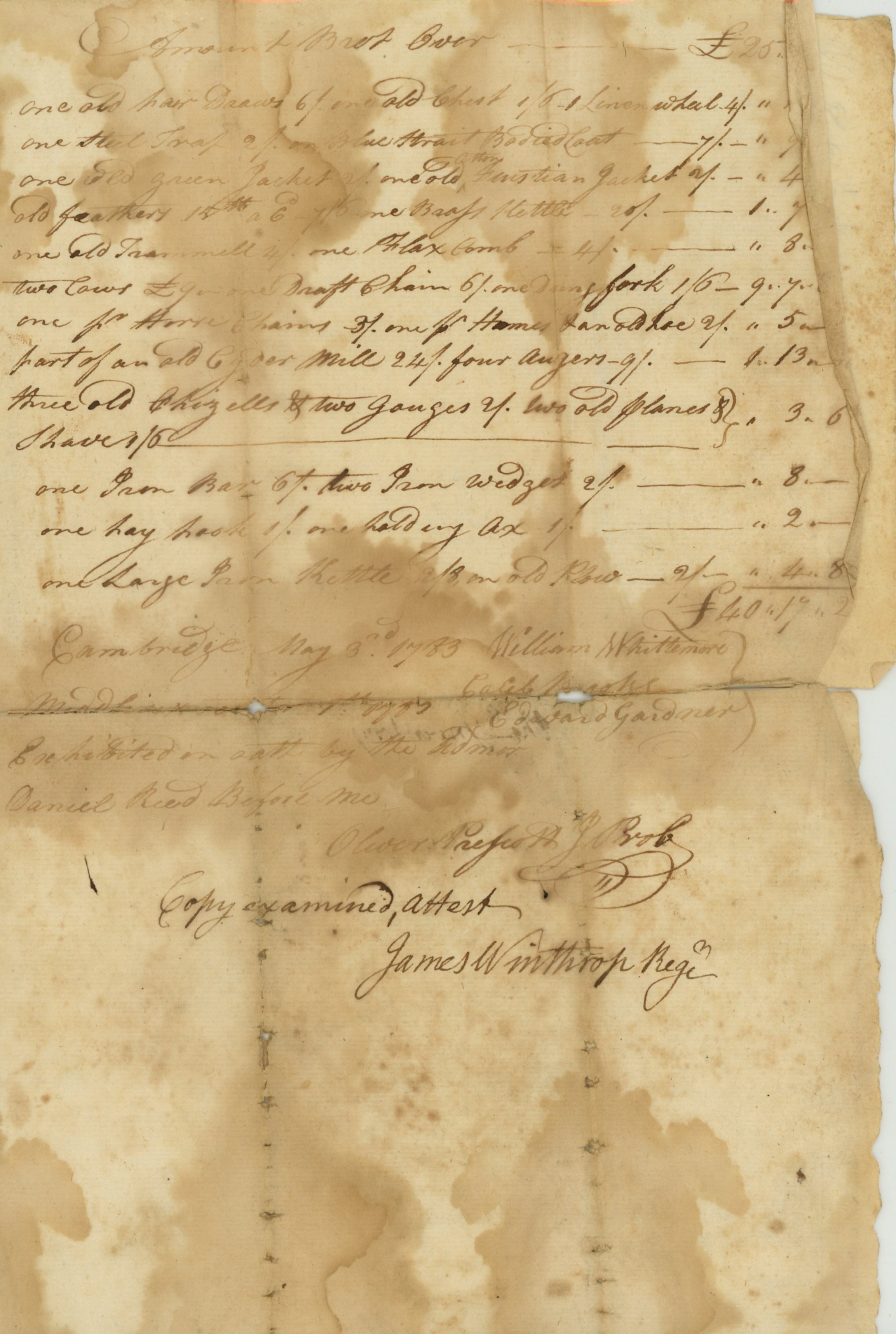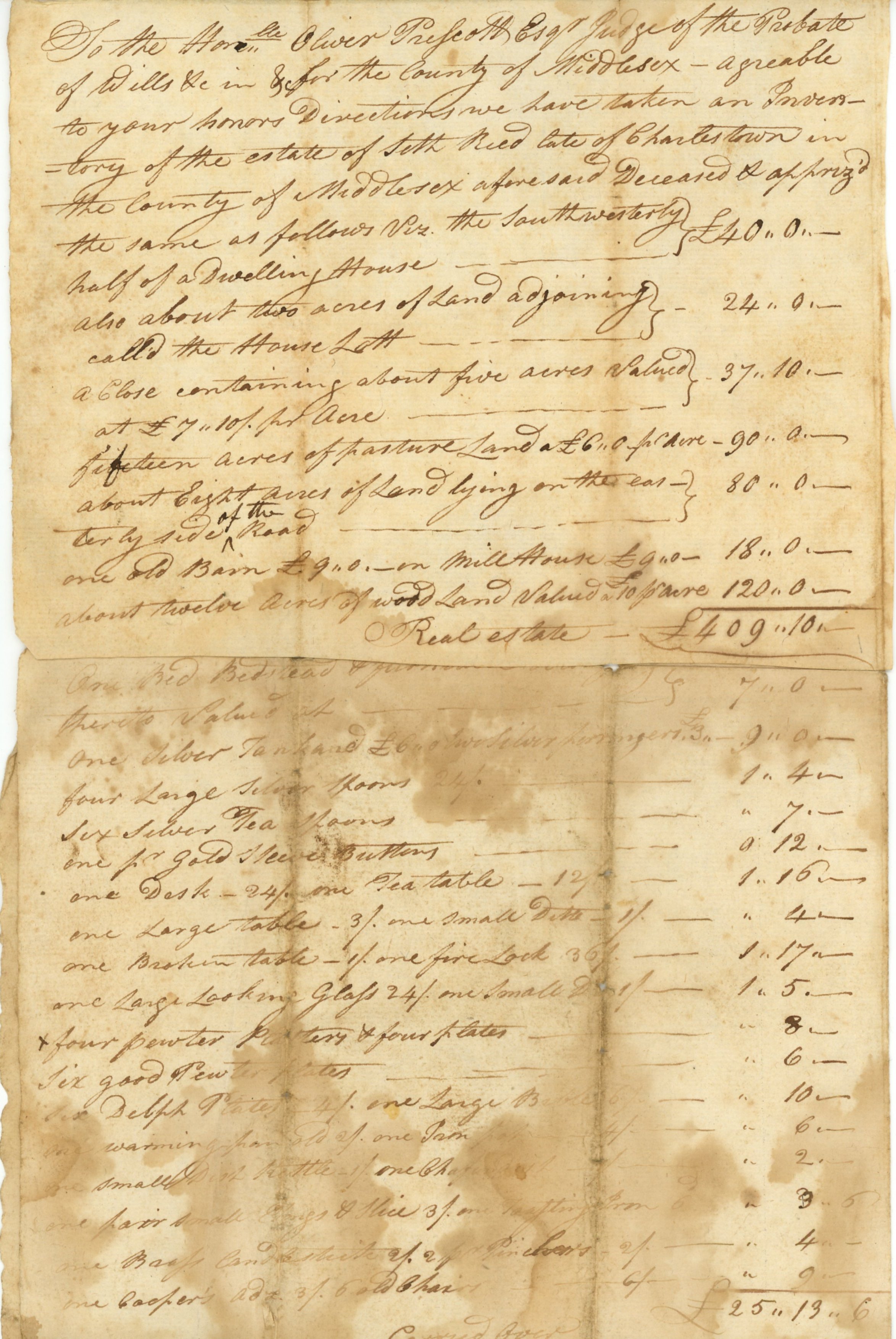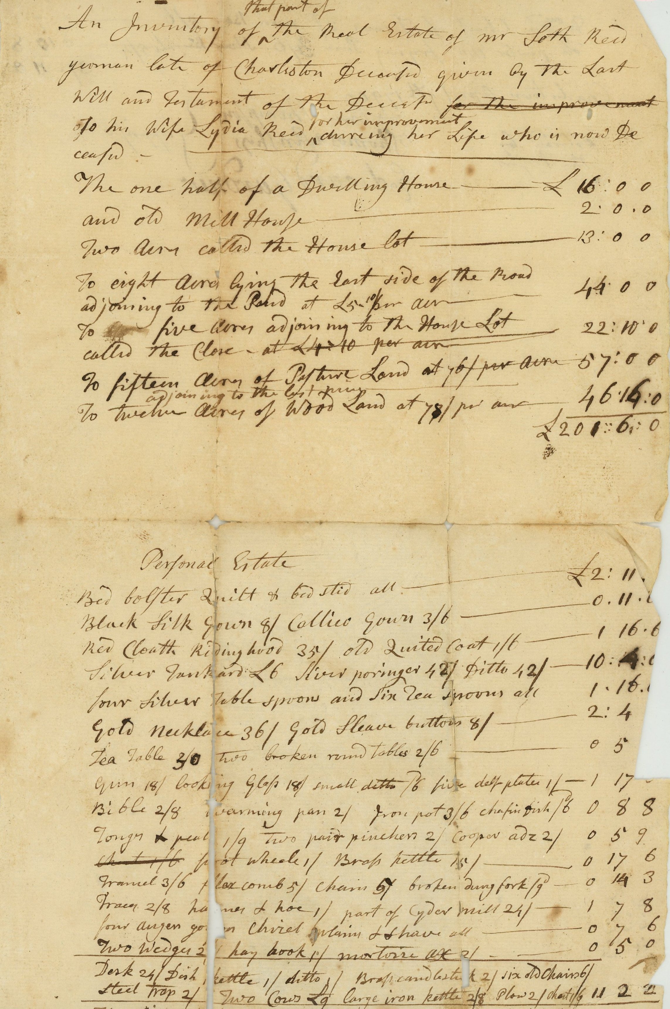 In 1790, appraisers inventoried Seth Reed’s estate for a second time. He had been deceased for seven years and the estate was in the possession of his widow, Lydia (Cutter) Reed. Laws at that time did not acknowledge women’s ownership of real estate, thus the appraisers kept the inventory in Seth’s name. It stated that Lydia had a dwelling house, an old mill house, as well as 42 acres of pastureland and woodland at an estimated worth of £201 6s. Her personal estate included items such as an old chest of drawers, several gowns, a gold necklace and gold sleeve buttons, a Bible, a pewter frying pan and a silver buckle for an estimated worth of £37 11s 2d.