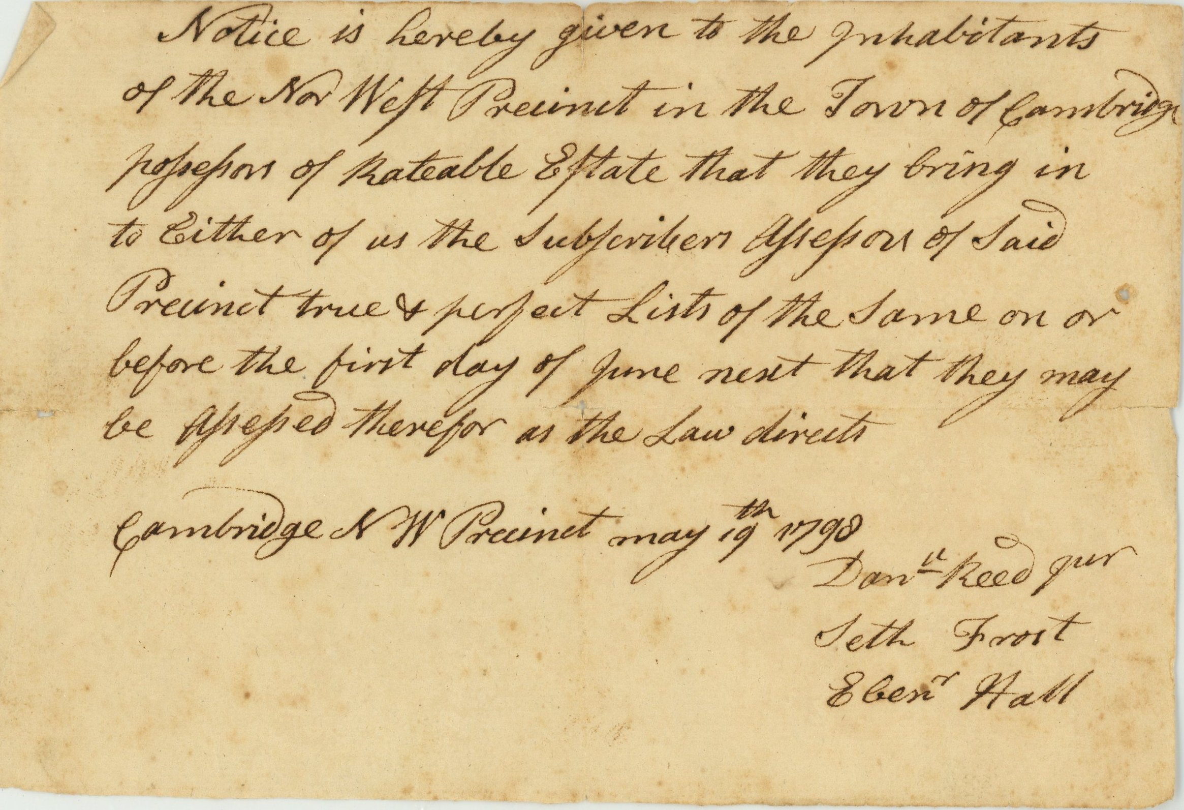 A notice given to inhabitants of the NW Precinct in Cambridge who own real estate to be assessed, 1798.