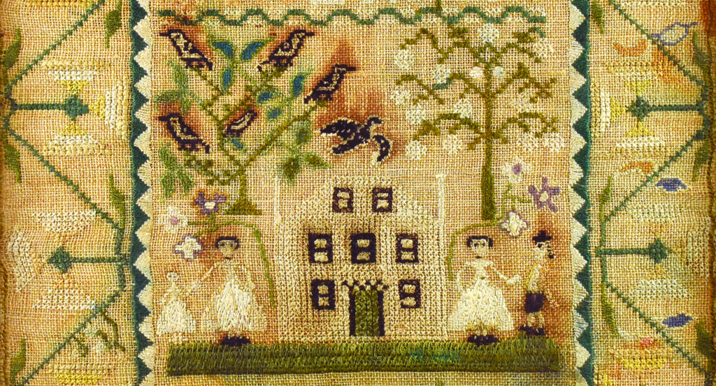 The samplers in the Historical Society’s collection were made primarily between 1790-1830, and they played an important role in education of girls. Before the advent of public education in the 1830’s, children were taught in small private schools in large cities and in villages. Most of these schools were ephemeral in nature and in session for only short periods—about six weeks at a time—which children would have attended for a varying number of sessions. While some samplers may have been produced at home under the supervision of a girl’s female relative, many were completed in one of these schools, typically run by a widow or an unmarried woman in the community.