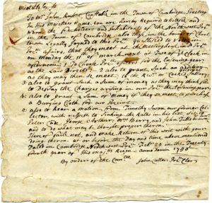 As part of my internship at the Arlington Historical Society, I recently had the opportunity of cataloguing twenty-six town meeting warrants for the Northwest Precinct of Cambridge- also known as Menotomy and present-day Arlington.[note]After a certain unknown year, the Northwest Precinct also came to include Charlestown. Please see: Medford Historical Society Papers. Vol. 14, p. 21. Medford, MA. 1911. Perseus Digital Library. 09 Aug 2017.[/note] The town warrants date between 1736 and 1795[note]Menotomy was part of the Northwest Precinct of Cambridge between 1732 and 1807. Please see: Ibid, p.21.[/note], covering a pivotal period from before to right after the American Revolution.[note]Notably, Elroy M. Avery, author of “A History of the United States and Its People”, said “Never was the town meeting more truly the voice of the popular will than in the gathering storm that ended in the war of American Independence.” Please see: Gott, “Town Meeting’s Place in American Democracy,” p.5.[/note] (See image above)