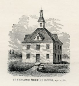 Town meetings were typically held yearly, on March afternoons.[note]Some town meetings were held on different months and there were years that had more than one meeting. Please see: Town Meeting Warrants, 2017.FIC. SMB.01.G.01, Arlington Historical Society, Arlington, MA.[/note] Although some meetings may have been held at schoolhouses or the courthouse,[note]Town Meeting Warrant, 05 Feb 1735. SMB.01.G.01, Accession Number 2017.FIC.8, Arlington Historical Society, Arlington, MA. 17 May 2017. & Town Meeting Warrant, 12 Mar 1795. SMB.01.G.01, Accession Number 2017.FIC.34, Arlington Historical Society, Arlington, MA. 28 Jun 2017.[/note] they most often took place at a centrally located meetinghouse that also functioned as the town parish.[note]Gott, “Town Meeting’s Place in American Democracy,” p.2.[/note] The original meetinghouse of Menotomy was known as the Second Parish, and it was located where the current First Parish Unitarian Universalist of Arlington stands- at the corner of Massachusetts Avenue and Pleasant Street.[note]The name changed once Menotomy became part of West Cambridge in 1807, before finally becoming Arlington in 1867. “Menotomy Minuteman Historical Trail: A Walking Tour of Arlington’s Past.” Menotomy Trail, p.7, http://www.menotomytrail.com/MenotomyMinutemanTrailGuide2.pdf. 09 Aug 2017.[/note] While we have little visual information of what it looked like, it was likely small and of simple wood construction, with minimal ornamentation.[note]“Religion in Colonial America: Trends, Regulations, and Beliefs.” Facing History and Ourselves, https://www.facinghistory.org/nobigotry/religion-colonial-america-trends-regulations-and-beliefs. 09 Aug 2017.[/note] (See image to the right for an example of a meetinghouse)