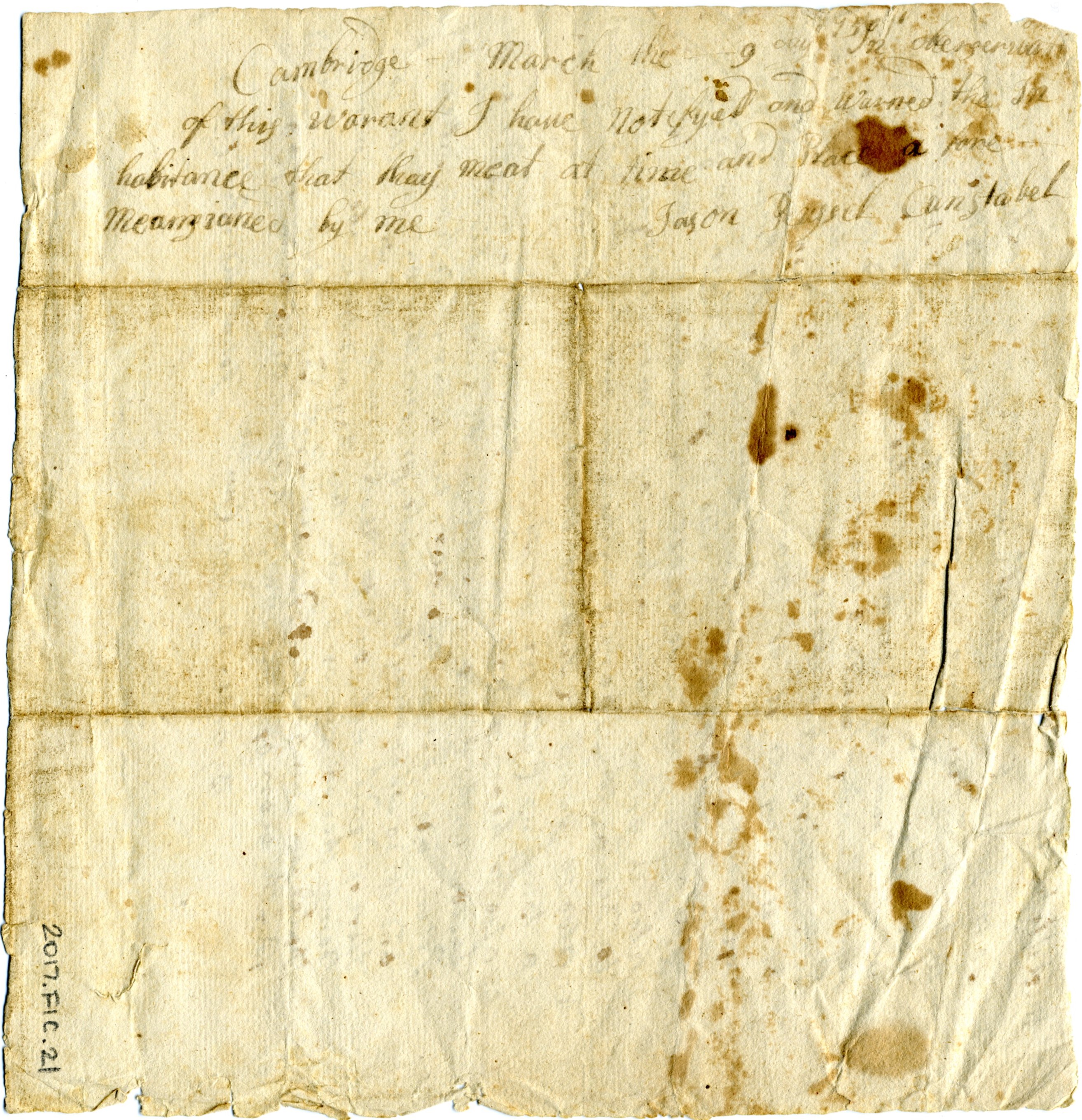 Amongst the many constables mentioned within the Northwest Precinct’s town warrants there is one named Jason Russell.[note]Town Meeting Warrant, 25 Feb 1750. SMB.01.G.01, Accession Number 2017.FIC.21, Arlington Historical Society, Arlington, MA. 06 Jun 2017.[/note]