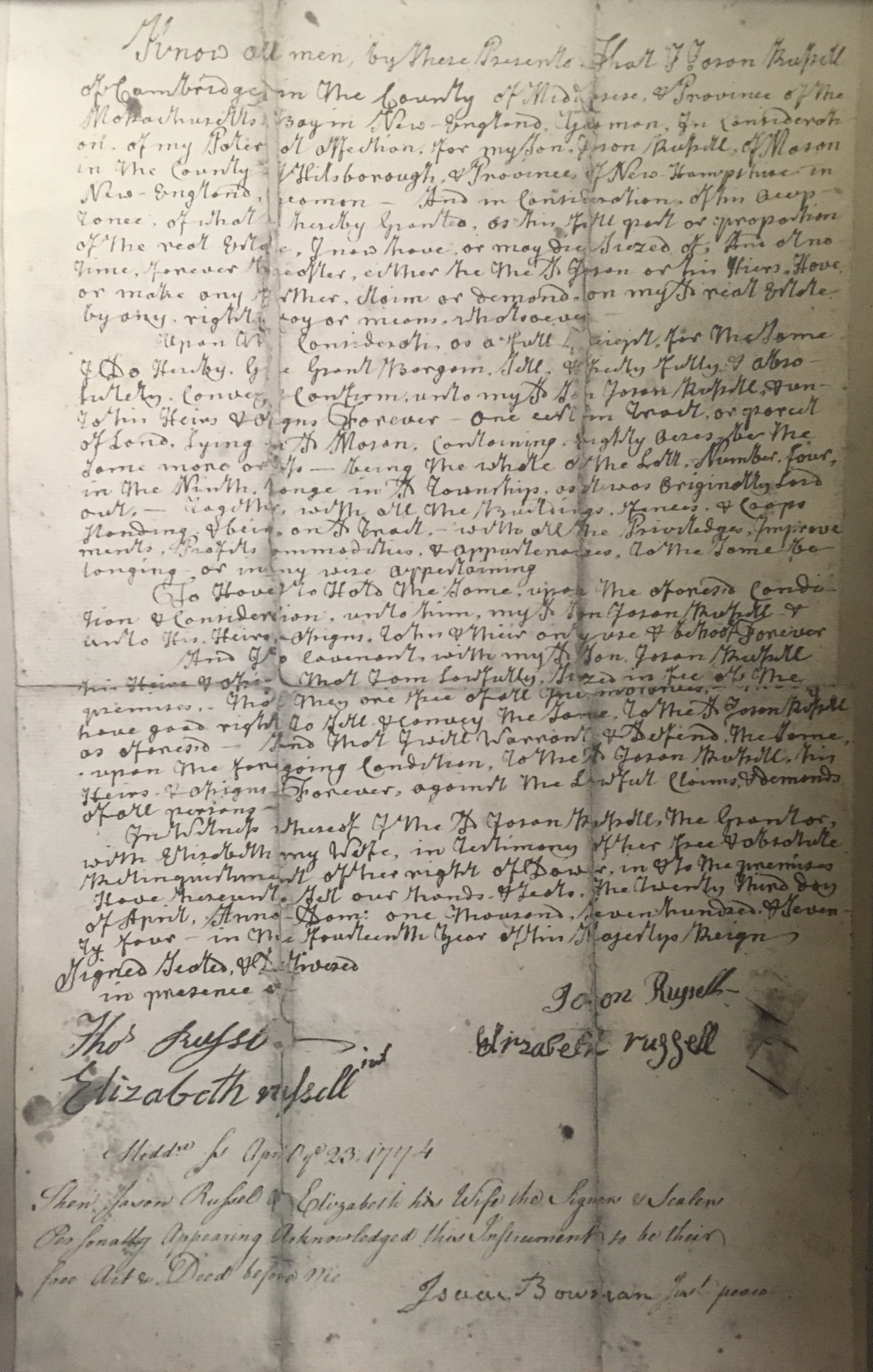 Another clue is that the signature on the town warrant exactly matches another “Jason Russell” signature on the copy of a deed within the Society’s collections. The deed is for a lot in Mason, New Hampshire from Jason Russell to his son.[note]Copy of a deed to a lot in Mason, NH. Shelf 3, Accession Number 1931.18.1, Arlington Historical Society, Arlington, MA. 06 Dec 2008.[/note] (See last two images below) These two documents make it very likely that Jason Russell was a constable during the year 1750/1. Thus, this potential find may offer an exciting new insight to a man that was important to not only Arlington but also American history.[note]Cutter also notes a Jason Russell who was a prudential committeeman in 1761-63 and 1768 as well as a precinct assessor in 1758 and 1761-63. Please see: Cutter, “History of the town of Arlington,” p.167.[/note]